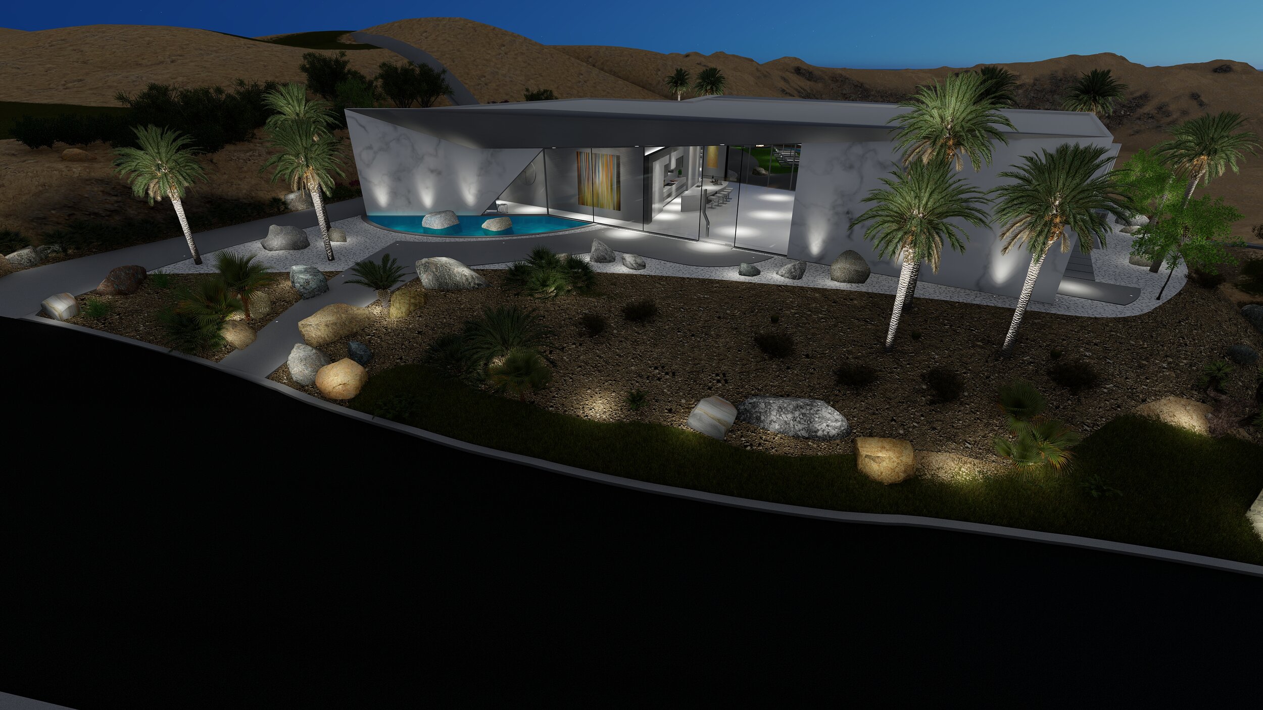 The approximately 3,800 square foot 3 bedroom, 3.5 bath, study and 3 car garage (optional 1,200 square foot guest house, outdoor kitchen and outdoor ZEN Lounge area off master bath as shown) masterpiece showcases expansive walls of sliding glass doors, clerestory windows, pool and spa all designed to enhance the Southern California Desert Lifestyle. The residence is perfectly positioned on a king size lot of nearly 34,000 square feet and is destined to be the epitome of PRIME. The views are unsurpassed with San Jacinto Mountain, Valley and sparkling City Light Views.